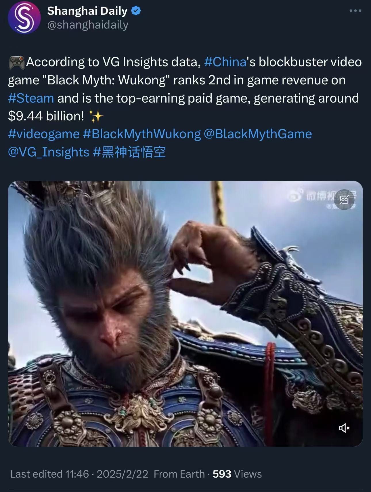 I finally got around to playing both the domestic and international versions of Black Myth: Wukong, and I found that they’re essentially the same. The gameplay is almost identical, with only a few tweaks in the international release aimed at appealing to global audiences. More than 90% of the game’s players are based in China, despite its success abroad. This highlights China’s growing ability to not only create globally competitive products but also to meet the demands of its own rapidly expanding digital market. Black Myth: Wukong shows that domestic success doesn’t necessarily require foreign markets—it can thrive without them, even as it finds international recognition.