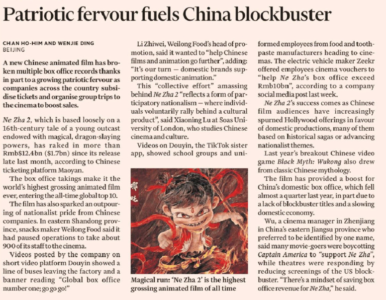 This shift is also playing out in other digital media. I took my kids to see Ne Zha 2 this weekend, a movie that has dominated the box office in China, with over 90% of its audience coming from within the country. The cute Lotus god has an ungodly number of marketing tie-ins on Chinese social media right now. There’s plenty of media to consume in China, but I’ve never seen Chinese audiences turning to locally produced content so enthusiastically. There is a growing appetite among Chinese consumers for content that reflects their culture. As China continues to produce more of its own blockbusters, it’s likely that fewer foreign films and games will make it to the Chinese market in the future. I’m just happy to not be dragged along to another Avengers movie.